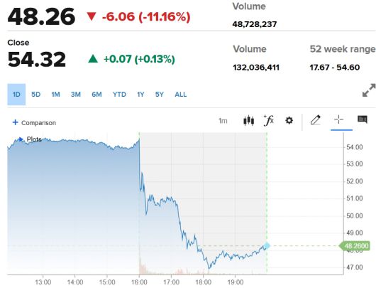 인텔 주가 추이. 22일(현지시간) 종가 54.32달러. 시간 외 거래 48.26달러. 출처 CNBC |