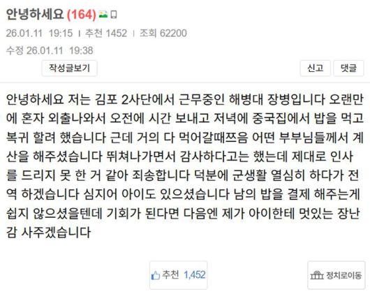 [뉴시스] 최근 온라인 커뮤니티 '보배드림'에는 식당에서 홀로 식사하던 군 장병의 밥값을 한 부부가 대신 결제하고 격려했다는 소식이 알려졌다. (사진=보배드림 캡처) *재판매 및 DB 금지 |
