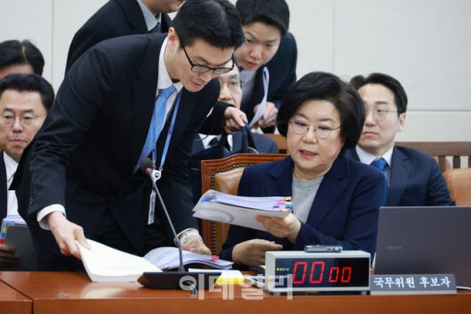 [이데일리 노진환 기자] 이혜훈 기획예산처 장관 후보자가 23일 서울 여의도 국회에서 열린 재정경제기획위원회의 인사청문회에서 시작 전 관계자들과 대화하고 있다.