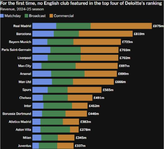 레알 마드리드는 상품 판매, 입장권, 중계권 등 전반적으로 고른 성장을 보였다. 특히 대규모 리노베이션을 마친 산티아고 베르나베우 스타디움을 기반으로 한 경기장 수입과 글로벌 스폰서십 확대가 매출 상승을 이끌었다. 보고서는 “레알 마드리드는 현대 축구에서 가장 안정적이고 강력한 수익 창출 모델을 구축한 구단”으로 평가했다.
