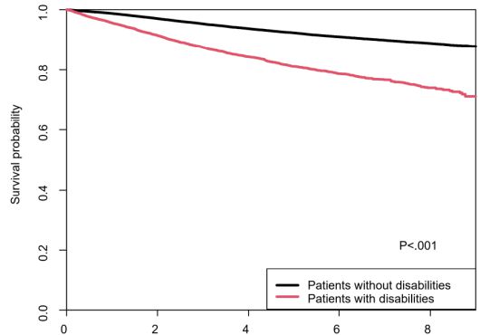 비장애인 환자는 5년 생존율 92.4%(검은색 곡선), 장애 환자는 81.1%(붉은색 곡선)를 기록했다 |