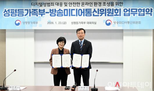 아시아투데이 박성일 기자 = 원민경 성평등가족부 장관과 김종철 방송미디어통신위원회 위원장이 23일 서울 종로구 정부서울청사 성평등가족부에서 열린 디지털성범죄 대응 및 안전한 온라인 환경 조성을 위한 성평등가족부-방송미디어통신위원회 업무협약식에서 협약식 후 기념촬영을 하고 있다. ⓒ "젊은 파워, 모바일 넘버원 아시아투데이"
