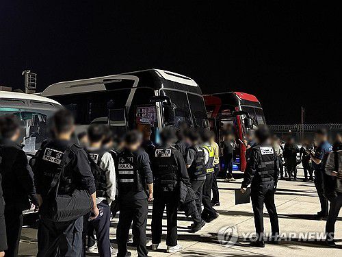 (서울=연합뉴스) 경찰이 23일 캄보디아 프놈펜국제공항에서 스캠(scam·사기), 인질강도 등 범행을 저지른 한국인 범죄 조직원들을 국내로 송환하기 위해 준비하고 있다. 2026.1.23 [경찰청 제공. 재판매 및 DB 금지]