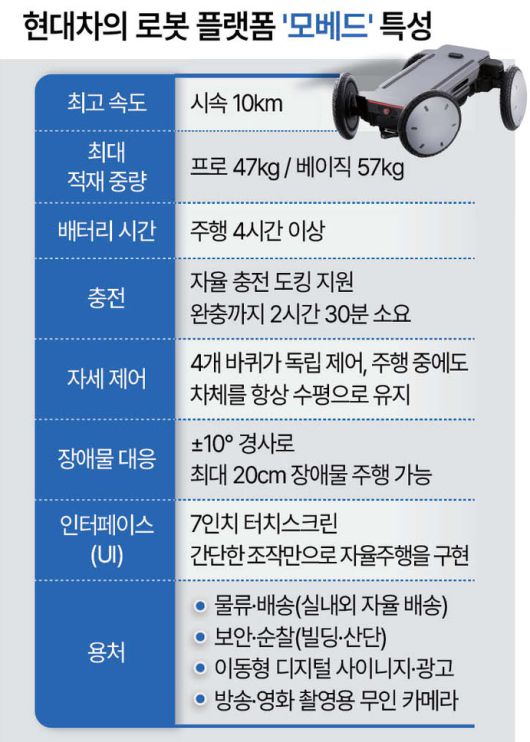 23일 업계에 따르면 현대차 로보틱스랩은 최근 모베드의 첫 공식 제품소개서를 배포하며 본격적인 영업에 돌입했다. 모베드는 올 1분기부터 양산 및 판매에 들어간다. 생산은 에스엘(SL)을 통한 위탁 방식이다.