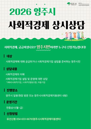 [더팩트ㅣ영주=김성권 기자] 경북 영주시가 사회적경제기업 설립과 운영을 지원하기 위해 '2026 영주시 사회적경제 상시 상담'을 운영한다고 23일 밝혔다.