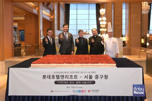이번 나눔은 롯데호텔의 시그니처 시즌 디저트인 '프리미엄 딸기케이크’가 시그니엘 서울과 부산, 롯데호텔 서울·월드·부산·제주 등에서 출시 5년 만에 누적 판매량 10만개를 돌파한 가운데, 10만번째 주인공이 중구에 위치한 롯데호텔 서울에서 나온 기념으로 진행됐다.