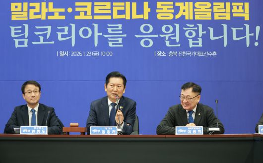 더불어민주당 정청래(가운데) 대표가 23일 충북 진천 국가대표선수촌에서 열린 현장 최고위원회의에서 발언하고 있다. /연합뉴스 |