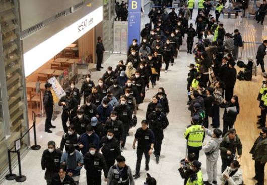 캄보디아 스캠 조직에서 활동하다 검거된 한국인 피의자 73명이 23일 인천국제공항을 통해 강제 송환되고 있다.