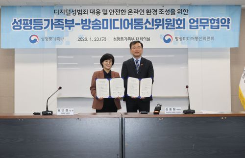 성평등가족부와 방송미디어통신위원회는 오늘(23일) 오전 정부서울청사에서 이같은 내용을 담은 '안전한 디지털 사회 실현을 위한 업무협약'을 맺었습니다.