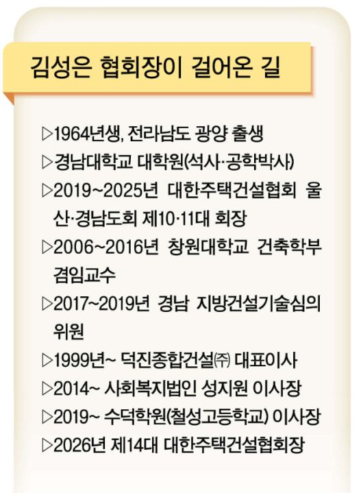 이 가운데 김 회장은 중소·중견 건설업체들의 목소리를 대변하는 제14대 대한주택건설협회장으로 취임했다.