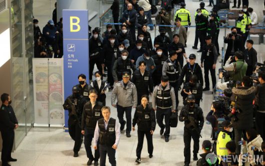 [영종도=뉴스핌] 정일구 기자 = 딥페이크 기술을 이용해 120억원을 가로챈 '로맨스 스캠 부부사기단' 등 캄보디아에서 각종 범행을 저지른 한국인 범죄 피의자 73명이 23일 오전 인천국제공항 제2여객터미널을 통해 송환되고 있다. 2026.01.23 mironj19@newspim.com