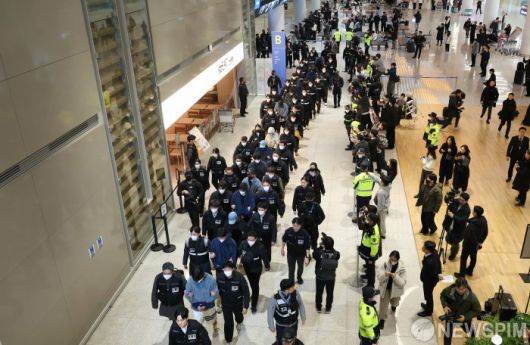 [영종도=뉴스핌] 정일구 기자 = 딥페이크 기술을 이용해 120억원을 가로챈 '로맨스 스캠 부부사기단' 등 캄보디아에서 각종 범행을 저지른 한국인 범죄 피의자 73명이 23일 오전 인천국제공항 제2여객터미널을 통해 송환되고 있다. 2026.01.23 mironj19@newspim.com |