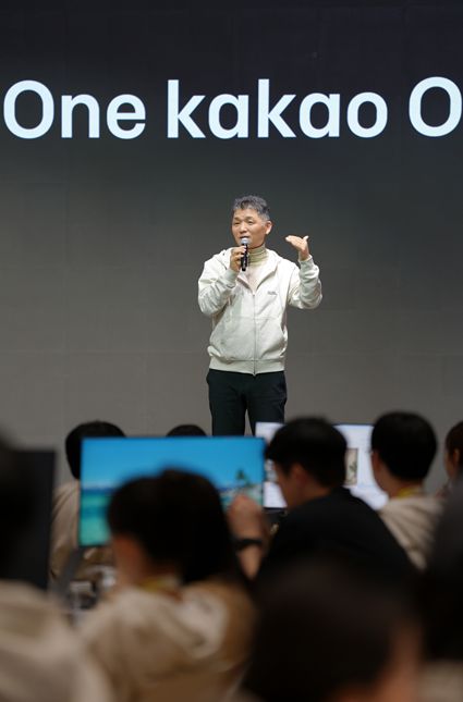 김범수 카카오 미래이니셔티브센터장이 그룹 신입 공채 교육 현장에 방문해 인사말을 하고 있다. [카카오 제공] |
