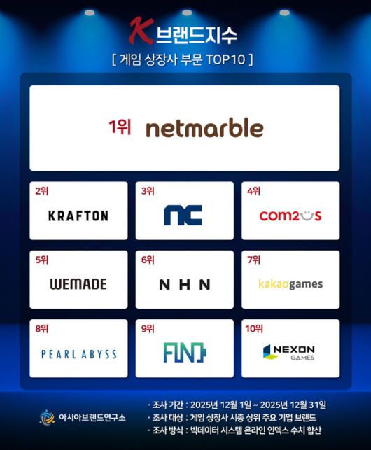 한정근 아시아브랜드연구소 대표는 "이번 K-브랜드지수 게임 상장사 부문은 넷마블이 견고한 브랜드 파워를 입증한 가운데, 크래프톤이 엔씨소프트를 제치고 2위로 올라서며 주목받고 있다. 이는 단일 게임 IP의 의존도를 넘어 글로벌 시장에서의 확장성과 장르 다변화 성과가 빅데이터 평판에 직접적인 영향을 미치고 있음을 시사한다"고 분석했다.