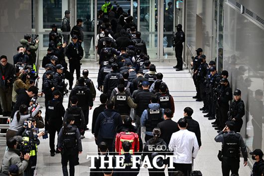 [더팩트ㅣ인천국제공항=남윤호 기자] 캄보디아에서 로맨스 스캠, 투자 리딩방 운영 등 범행을 저지른 한국인 조직원들이 23일 인천국제공항 제2터미널로 강제 송환돼 호송차로 이동하고 있다.