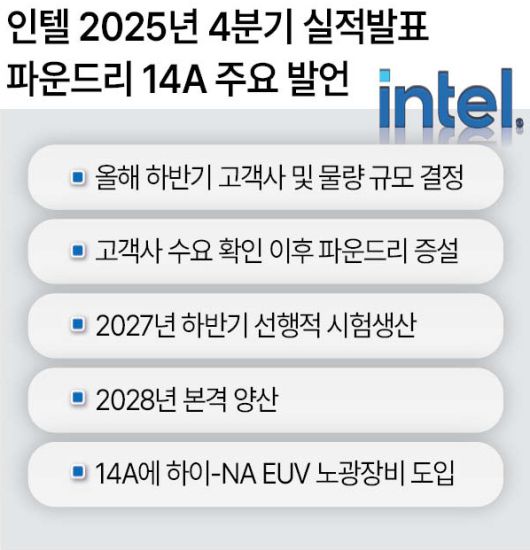 미국 파운드리(반도체 위탁생산) 산업의 재건을 책임지고 있는 인텔이 올해 하반기 14A(1.4나노급) 공정의 구체적인 고객사 물량이 결정될 것이라며 2027년 시험 생산을 거쳐 2028년부터 본격 양산 단계에 진입할 것이라고 밝혔다.