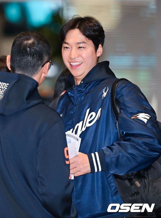[OSEN=인천공항, 민경훈 기자] 프로야구 한화 이글스가 2026 시즌을 준비하기 위해 23일 오전 인천공항을 통해 호주 멜버른으로 1차 스프링캠프를 떠났다. 김경문 감독이 이끄는 한화 선수단은 코치진 17명, 선수 46명을 합해 63명으로 1차 스프링캠프 명단을 꾸렸다. 한화 엄상백이 출국길에 오르며 미소 짓고 있다. 2026.01.23 / rumi@osen.co.kr