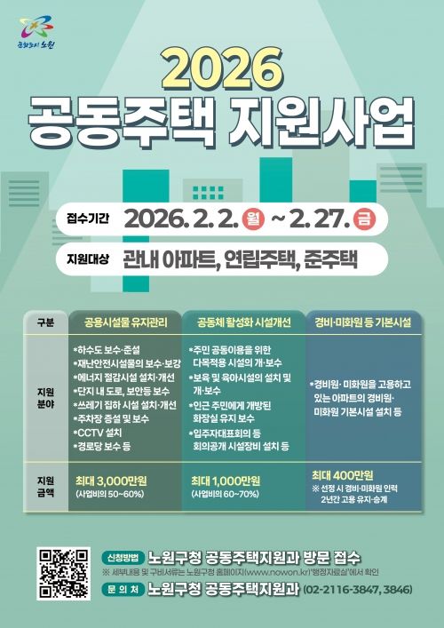 서울 노원구가 안전한 주거환경 조성과 공동체 활성화를 위해 ‘2026년 공동주택 지원사업’을 시작한다고 23일 밝혔다.