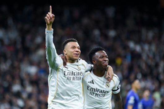 (260121) -- MADRID, Jan. 21, 2026(Xinhua) -- Real Madrid's Kylian Mbappe (L) celebrates a goal with teammate Vinicius Junior during the UEFA Champions League match between Real Madrid and AS Monaco, Madrid, Spain, Jan. 20, 2026. (Photo by Gustavo Valiente/Xinhua)<저작권자(c) 연합뉴스, 무단 전재-재배포, AI 학습 및 활용 금지> |