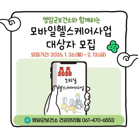 모바일 헬스케어 사업 참여 신청은 오는 26일부터 내달 13일까지 영암군보건소 건강관리팀으로 하면 되며 50명을 선착순으로 모집한다.