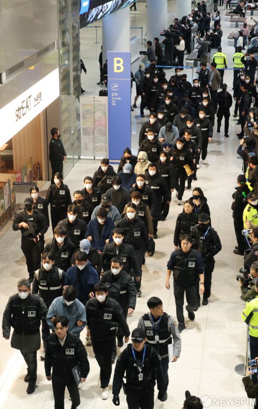[영종도=뉴스핌] 정일구 기자 = 딥페이크 기술을 이용해 120억원을 가로챈 '로맨스 스캠 부부사기단' 등 캄보디아에서 각종 범행을 저지른 한국인 범죄 피의자 73명이 23일 오전 인천국제공항 제2여객터미널을 통해 송환되고 있다. 2026.01.23 mironj19@newspim.com