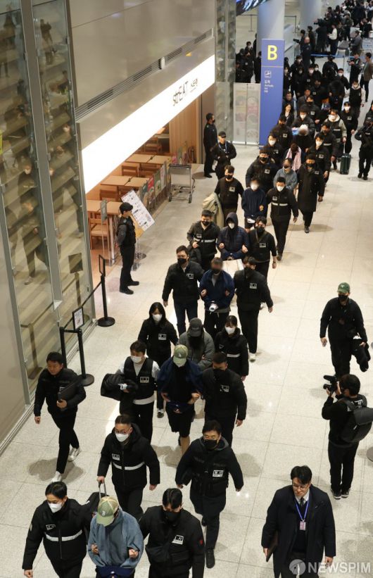 [영종도=뉴스핌] 정일구 기자 = 딥페이크 기술을 이용해 120억원을 가로챈 '로맨스 스캠 부부사기단' 등 캄보디아에서 각종 범행을 저지른 한국인 범죄 피의자 73명이 23일 오전 인천국제공항 제2여객터미널을 통해 송환되고 있다. 2026.01.23 mironj19@newspim.com