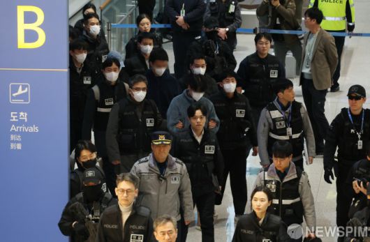 [영종도=뉴스핌] 정일구 기자 = 딥페이크 기술을 이용해 120억원을 가로챈 '로맨스 스캠 부부사기단' 등 캄보디아에서 각종 범행을 저지른 한국인 범죄 피의자 73명이 23일 오전 인천국제공항 제2여객터미널을 통해 송환되고 있다. 2026.01.23 mironj19@newspim.com