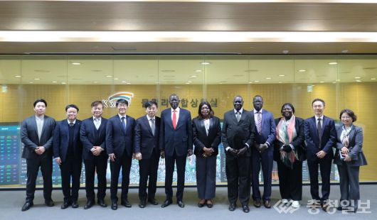 지난 21일 한국수자원공사 본사를 방문한 남수단 대표단이 고위급 면담을 갖고 남수단 고등교육·과학기술부와 물관리 역량 강화를 위한 지식교류·협력 업무협약을 체결한 뒤, 디지털트윈 빅보드가 적용된 물관리종합상황실을 둘러보고 기념 포즈를 취하고 있다. /대전=이한영기자
