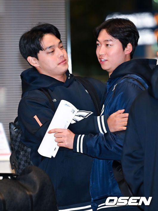 [OSEN=인천공항, 민경훈 기자] 프로야구 한화 이글스가 2026 시즌을 준비하기 위해 23일 오전 인천공항을 통해 호주 멜버른으로 1차 스프링캠프를 떠났다. 김경문 감독이 이끄는 한화 선수단은 코치진 17명, 선수 46명을 합해 63명으로 1차 스프링캠프 명단을 꾸렸다. 한화 문동주와 엄상백이 출국길에서포옹을 하고 있다. 2026.01.23 / rumi@osen.co.kr