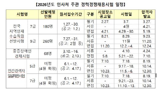 인사처가 주관하는 경채 시험의 원서접수 일정은 △27일 7급 지역인재 선발 △3월 10일 중증장애인 선발 △6월 1일 5·7급 민간경력자 일괄채용 △7월 27일 9급 지역인재 선발 등이다.