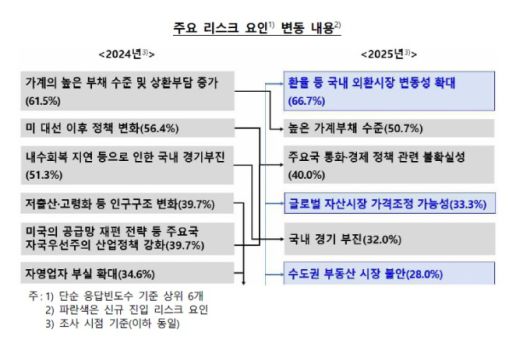 단순 응답빈도 기준으로는 외환시장 변동성 확대(66.7%)에 이어 높은 가계부채 수준(50.7%), 국내 경기 부진(32.0%)이 주요 대내 리스크 요인으로 꼽혔다. 대외 요인으로는 주요국 통화·경제 정책 관련 불확실성(40.0%)과 글로벌 자산시장 가격조정 가능성(33.3%)이 상위 리스크로 조사됐다.