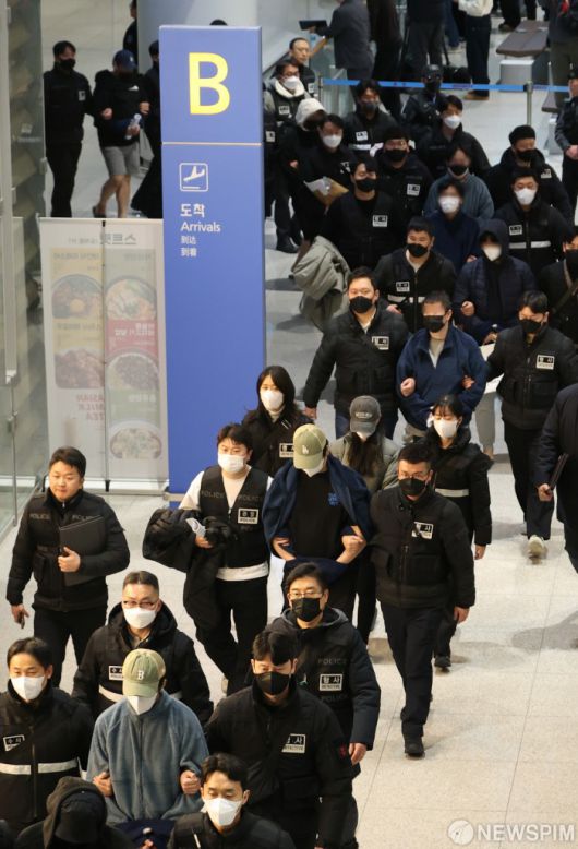 [영종도=뉴스핌] 정일구 기자 = 딥페이크 기술을 이용해 120억원을 가로챈 '로맨스 스캠 부부사기단' 등 캄보디아에서 각종 범행을 저지른 한국인 범죄 피의자 73명이 23일 오전 인천국제공항 제2여객터미널을 통해 송환되고 있다. 2026.01.23 mironj19@newspim.com |