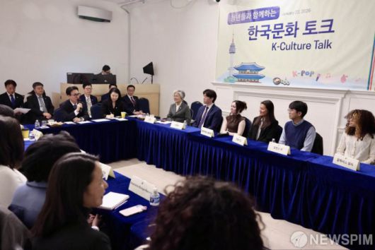 [서울=뉴스핌] 김민석 국무총리가 22일(현지시간) 미국 워싱턴 DC 한국문화원에서 미국 청년들과 함께하는 한국문화 간담회에서 발언하고 있다. [사진=총리실] 2026.01.23 photo@newspim.com