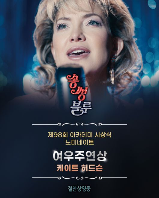[스타데일리뉴스=조수현기자] 개봉 이후 관객들의 뜨거운 공감과 호평을 이어가고 있는 감성 뮤직 드라마 <송 썽 블루>가 제98회 아카데미 시상식 여우주연상 부문에 케이트 허드슨이 노미네이트되며, 그녀의 빛나는 존재감과 작품의 깊은 울림을 다시 한번 입증했다.