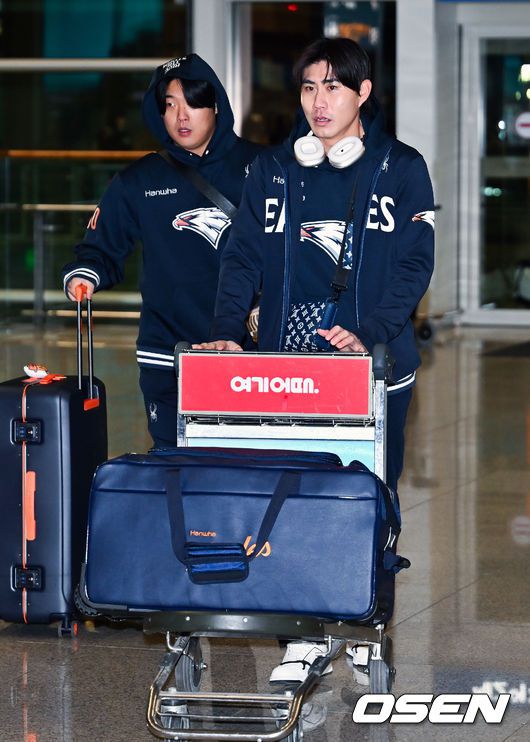 [OSEN=인천공항, 민경훈 기자] 프로야구 한화 이글스가 2026 시즌을 준비하기 위해 23일 오전 인천공항을 통해 호주 멜버른으로 1차 스프링캠프를 떠났다. 김경문 감독이 이끄는 한화 선수단은 코치진 17명, 선수 46명을 합해 63명으로 1차 스프링캠프 명단을 꾸렸다. 한화 심우준과 강백호가 출국길에 오르고 있다. 2026.01.23 / rumi@osen.co.kr
