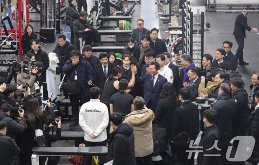 (진천=뉴스1) 김용빈 기자 = 정청래 더불어민주당 대표가 23일 충북 진천선수촌 웨이트트레이닝장에서 국가대표 선수들을 격려하고 있다. 2026.1.23/뉴스1vin06@news1.krCopyright ⓒ 뉴스1. All rights reserved. 무단 전재 및 재배포, AI학습 이용 금지.