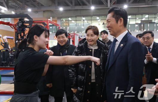 (진천=뉴스1) 김용빈 기자 = 정청래 더불어민주당 대표가 23일 충북 진천선수촌 웨이트트레이닝장에서 국가대표 선수와 함께 대화를 나누고 있다. 2026.1.23/뉴스1vin06@news1.krCopyright ⓒ 뉴스1. All rights reserved. 무단 전재 및 재배포, AI학습 이용 금지.
