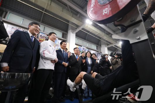 (진천=뉴스1) 김용빈 기자 = 정청래 더불어민주당 대표가 23일 충북 진천선수촌 웨이트트레이닝장에서 선수들을 격려하고 있다. 2026.1.23/뉴스1vin06@news1.krCopyright ⓒ 뉴스1. All rights reserved. 무단 전재 및 재배포, AI학습 이용 금지.