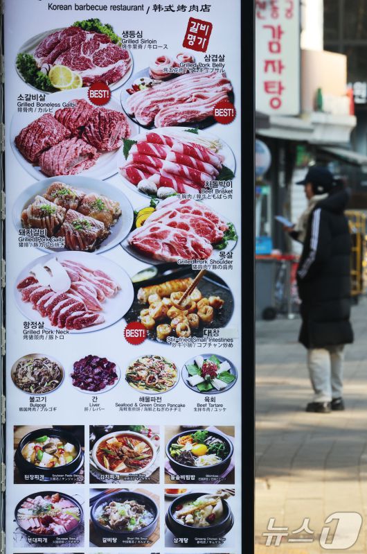 (서울=뉴스1) 이광호 기자 = 23일 서울 중구 명동에서 시민이 한식당 앞을 지나가고 있다. 한국소비자원 가격정보포털 참가격에 따르면 지난해 1년 동안 외식비는 최대 5%이상 상승했으며 김밥·자장면 같은 서민 음식부터 삼겹살·삼계탕·면류까지 외식 메뉴 전반이 올랐다. 2026.1.23/뉴스1