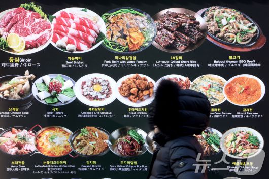 (서울=뉴스1) 이광호 기자 = 23일 서울 중구 명동에서 시민이 한식당 앞을 지나가고 있다. 한국소비자원 가격정보포털 참가격에 따르면 지난해 1년 동안 외식비는 최대 5%이상 상승했으며 김밥·자장면 같은 서민 음식부터 삼겹살·삼계탕·면류까지 외식 메뉴 전반이 올랐다. 2026.1.23/뉴스1
