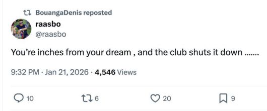 보도에 따르면, 부앙가는 X(구 트위터)를 통해 "당신은 꿈에서 몇 인치 떨어져 있었지만, 구단이 그것을 막았다(You’re inches from your dream, and the club shuts it down)"라는 문장을 리트윗(공유)했다.