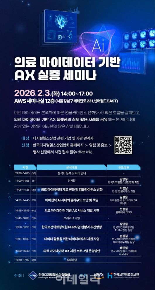[이데일리 김승권 기자] 한국디지털헬스산업협회(이하 디산협)는 오는 2월 3일 오후 2시부터 5시까지 서울 강남구 아마존웹서비스(AWS) 코리아 사무실에서 ‘의료 마이데이터 기반 AX(AI 전환) 실증 세미나’를 개최한다.