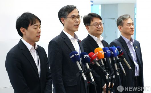 [영종도=뉴스핌] 정일구 기자 = '초국가범죄 특별대응 TF' 유승렬 치안감(왼쪽 두번째)이 23일 오전 인천국제공항 제2여객터미널 입국장에서 '로맨스 스캠 부부사기단' 등 캄보디아에서 각종 범행을 저지른 한국인 범죄 피의자 73명 송환 관련 브리핑을 하고 있다. 2026.01.23 mironj19@newspim.com |