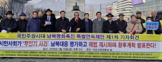 지난 16일 오후 2시부터 서울 광화문광장 이순신 장군 동상 앞에서는 '공익감시 민권회의'(상임의장 송운학)를 비롯한 34개 시민단체가 공동으로 '국민주권시대 남북평화촉진 특별연속제안 제1차 기자회견'을 열고, 무인기 사건에 대한 대응 방안을 발표했다.