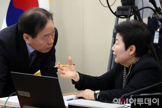 아시아투데이 이병화 기자 = 임이자 국회 재정경제기획위원회 위원장이 23일 국회에서 열린 재정경제기획위원회의 이혜훈 기획예산처 장관 후보자 인사청문회에서 정태호 더불어민주당 간사가 대화하고 있다. ⓒ "젊은 파워, 모바일 넘버원 아시아투데이"