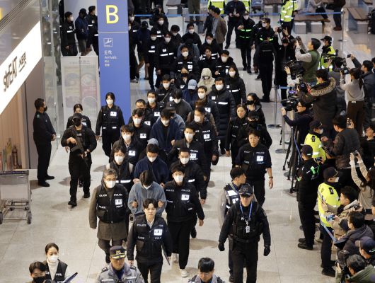 초국가 범죄 대응을 위해 구성된 범정부 태스크포스(TF)는 한국민 869명에게 약 486억원을 편취한 혐의를 받는 한국 국적 피의자 73명을 국내로 송환한다고 이날 밝혔다. 이들을 태운 대한항공 KE9690편은 캄보디아 프놈펜에서 출발해 이날 오전 9시 41분쯤 인천국제공항에 착륙했다.