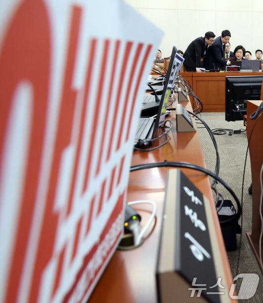 (서울=뉴스1) 국회사진기자단 = 국민의힘 의원들이 23일 서울 여의도 국회에서 열린 재정경제기획위원회의 이혜훈 기획예산처 장관 후보자에 대한 인사청문회에서 노트북에 피켓을 붙여 놓고 있다. 2026.1.23/뉴스1 Copyright ⓒ 뉴스1. All rights reserved. 무단 전재 및 재배포, AI학습 이용 금지.