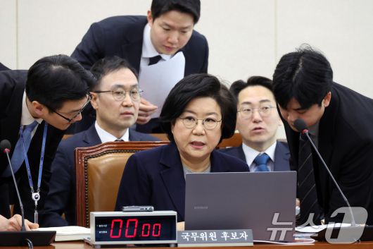 (서울=뉴스1) 국회사진기자단 = 이혜훈 기획예산처 장관 후보자가 23일 서울 여의도 국회에서 열린 인사청문회에 출석해 관계자와 대화하고 있다. 2026.1.23/뉴스1