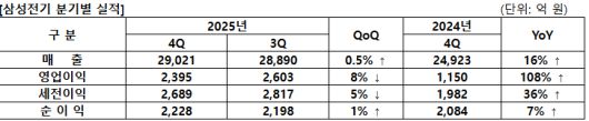 컴포넌트 부문의 4분기 매출은 연말 재고조정 등으로 전 분기보다 4% 감소했지만, AI·서버 및 파워용 MLCC 공급을 확대해 전년 동기보다 22% 늘어난 1조3203억 원을 기록했다.