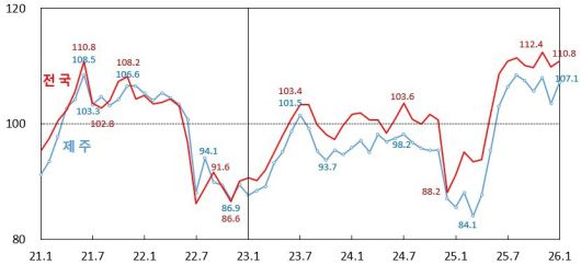 한국은행 제주본부가 23일 발표한 '2026년 1월 제주지역 소비자동향조사 결과'에 따르면 이달 제주의 소비자심리지수는 107.1로 전월보다 3.6p 상승했다.